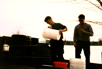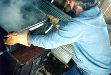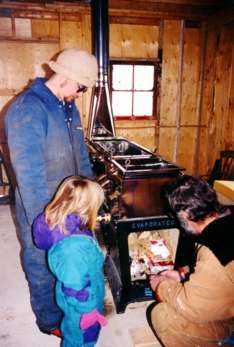 Our new evaporator was made to handle 200 taps but that was nearly what we were doing using the old flat bottom pan so we knew we could press the envelope a little. The first year of operation, 1998, we had 125 taps on our own farm and Pierre tapped his bush as well. The difference in efficiency was remarkable. The fluted pan gave ever so much more surface area to the fire probably equivalent to 3 or 4 times that of our previous flat pan. The wood consumption was also much less per litre of syrup produced. Not so much unused heat just escaping up the chimney. The quality of the syrup also increased due to the faster boil and the closed gravity system. You can see how this works from the picture above where we fill the outside tank that flows directly into the evaporator. This flow is controlled by a check valve. One early morning when Nancy went out to check the fire she accidentally flipped off the check valve. Now freezing cold sap was overflowing onto the floor as she was desperately trying to reseat the float valve with her bare hands. Needless to say, it did not take too long after that to introduce a shut off valve just before the float valve of the evaporator.