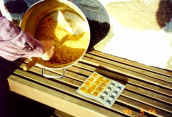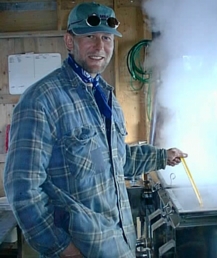 The syrup becomes more concentrated as it moves from the far end of section "a" through section "b" then into the small tank "c" and finally is at its most concentrated in section "d". The evaporator can be used to produce the correct concentration, 66 brix, but we have found that the operation runs more smoothly if we do the final finishing in the propane pan. We normally draw off the syrup from section "d" when the brix content is around 50. In the picture above, Martin is about to check the syrup in section "d" to see if it is ready to transfer to the propane pan.