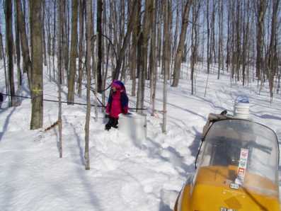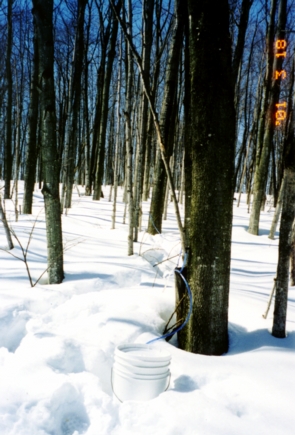 Pete marked the trees in 1998 and four years of chainsaw work has not yet completed the entire project. And in a couple of years it will be time to repeat the process as sylvaculture is measured in decades. Even so, we have been able to provide enough fire wood to power our evaporator,our home, and the homes of a number of the Marcoux clan! A huge amount of renewable energy! Most of the trees that were not maple have now been cut, but we have decided to tap the small marked maples rather than cut them down immediately. These taps are not very productive but using them now allows the good maples to grow for a few more years without the stress of tapping.