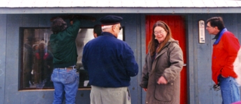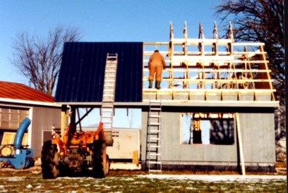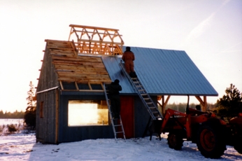 A concrete base that had originally been used as a feeding area for the cattle already existed just across from our workshop, close to water and hydro, the necessities of a modern, comfortable sugar shack. Work began in the Fall of '97 with the pouring of a flat floor over the existing concrete pad along with 5 inch concrete bases for the walls. Two large windows, originally patio doors, were scrounged from a local window shop to provide a good view and lots of light. The Badgers had suggested that we should have a wood ceiling to reduce the condensation and we were lucky to find just the right amount of tongue and groove wood from Liz and Brad. I wanted a steep roof so decided on a 45 degree slope, an angle that also made the best use of the plywood sheathing that we lined the shack with to prevent drafts. The only really tricky part, tricky for those of us who are not so enthusiastic about heights, was the very top of the shack where the roof vents were located. That little bit of steel roofing was not a pleasant experience. The shack was completed in time for the grand opening in February '98. The total cost, materials, was $2,800 for the building + $2,600 for the evaporator = $5,400.