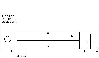 The sap is collected in the morning and again in the late afternoon. A small Honda pump is used to move the sap from the collection barrels to the holding tank beside the shack. This holding tank is elevated above the evaporator ensuring a constant flow of sap to the pan. With a good fire, there is a constant trickle of fresh sap entering the large tank of the evaporator. The large tank is divided in half longitudinally and, to ensure that the cold sap does not reduce the boil, it flows through a stainless tube to the far end of the opposite half (section a in the diagram). A second smaller flat bottomed tank sits just above the fire box. This tank is also divided in half and connected by an external pipe to the main tank. Long handled plugs are supplied to stop the flow between the large and small tanks. Once we have a good boil going we can draw off the syrup from the far end of the evaporator.