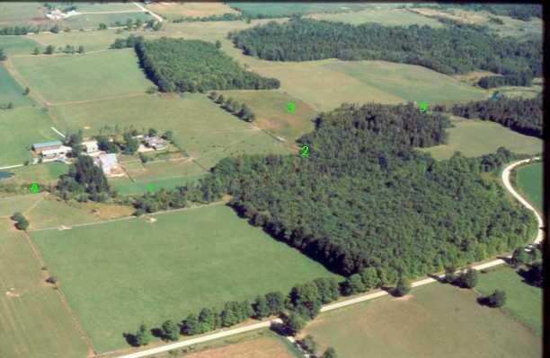 Water samples from the Noisy River were taken from three locations (see #4 and #5 on aerial map - sample 1 location is not in the photo) in March, 2003 and repeated at the same locations in May of 2003. Unfortunately, similar stream water sampling was not conducted prior to the grass buffer being installed.