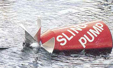 Inside the nose cone of the sling pump is a coil of plastic pipe. As the running water rotates the cone, the open end of the pipe at the large end alternately picks up air and water that eventually migrates to the smaller end of the cone. It is the now compressed bubble of air at the small end of the cone that provides the pressure to pump the water to a height.