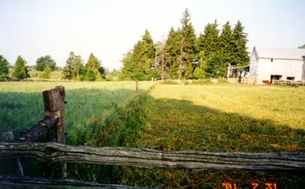 The Healthy Waters program, provided through the Nottawasaga Valley Conservation Authority, was used to fund a buffer strip between the barn and the river in 2001. Reed Canary and Orchard Grass was seeded with a nurse crop of mixed grain in the buffer area and an electric fence was erected to restrict the cattle. The forage crops that make use of the high levels of nutrient in the soils are harvested annually as round bale sileage leaving an aftermath growth of 20 to 30 cm for the winter to restrict the direct flow of water down the slope. The following photo shows the results of the planting: