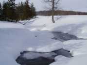 When the first ram pump was installed in 1993 we also installed a gravity feed system to supply water to our mature cows during the winter. Prior to this installation the cows had accessed the Noisy river directly via a small side stream that had been constructed before we purchased the farm in 1972. As with the ram pump, we used the natural fall of the river as it flowed through the farm and placed a 4" plastic tile line in the stream until we had reached a height above our water station of about 3 feet. In retrospect we should have gone further up the river to create a greater head of water and we would have been able to place the water tank further from the stream.