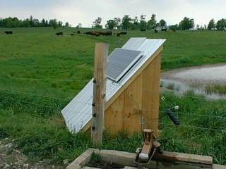 A solution to this problem was the installation of a small solar power system that we located adjacent to one of the farm ponds. This particular pond usually serviced the largest herd of cattle and the two nose pumps were just able to keep up with the demand. To supply the power to only run the fencer would have required a smaller solar collector but we decided to purchase a 120 watt panel so that sufficient power would be generated to run a small water pump as well.